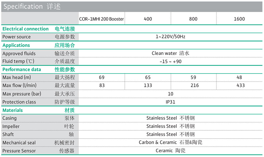 特征 變頻控制 低噪音,低震動 PLC和變頻技術相結合,避免水泵頻繁啟停 陶瓷傳感器,可靠性高 流量延時停機 不銹鋼水力部件 易操作,易維護 內置缺水保護