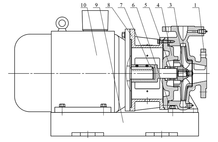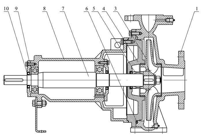 泵為非自吸、單級單吸臥式,軸向進(jìn)水,徑向出水, 泵體底部與底座固定。