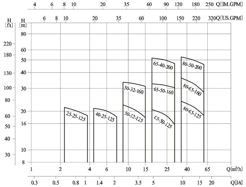 泵的使用參照加粗曲線的性能范圍,以防流量過(guò)大使電機(jī)過(guò)載。